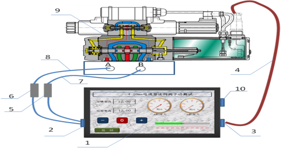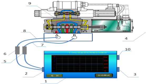 1、在線判斷液壓控制閥設(shè)備故障;在現(xiàn)代化的生產(chǎn)線包含有液壓控制閥的設(shè)備一旦出現(xiàn)故障,普通員工很難判斷是機械故障、液壓故障還是電氣控制故障;該儀器可解決上述問題,一步,斷開與液壓控制閥相連的電氣插頭,把本儀器配套的插頭插上,二步,將壓力傳感器的兩根測壓線連接到液壓控制閥的A、B口測壓點上,三步,打開本儀器電源,選擇與液壓控制閥相對應的信號,手動測試即可判斷是機械故障、液壓故障還是電氣控制故障;如下圖: