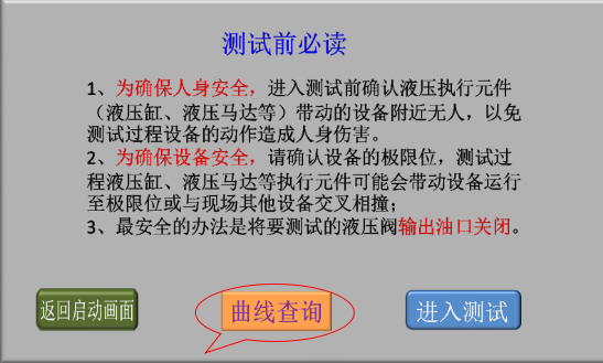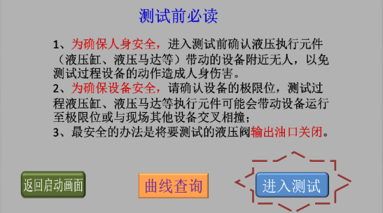 3、確認(rèn)現(xiàn)場人員和設(shè)備安全后,點擊“進(jìn)入測試”,進(jìn)入液壓閥測試類型選擇畫面;