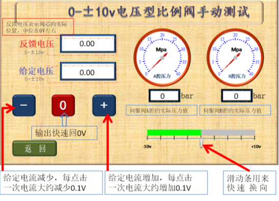 6、比例閥正常時的表現(xiàn)為:a、給定電流OV時,反饋電流在0V,比例閥輸出的A、B腔壓力相同;b、用滑動條可迅速換向,反饋電流改變且A、B腔壓力差較大;c、點擊增加按鈕,反饋電流逐漸增加且A、B腔壓力差逐漸增大;d、點擊減少按鈕,反饋電流逐漸減少且A、B腔壓力差逐漸減少,過0V后比例閥會換向;